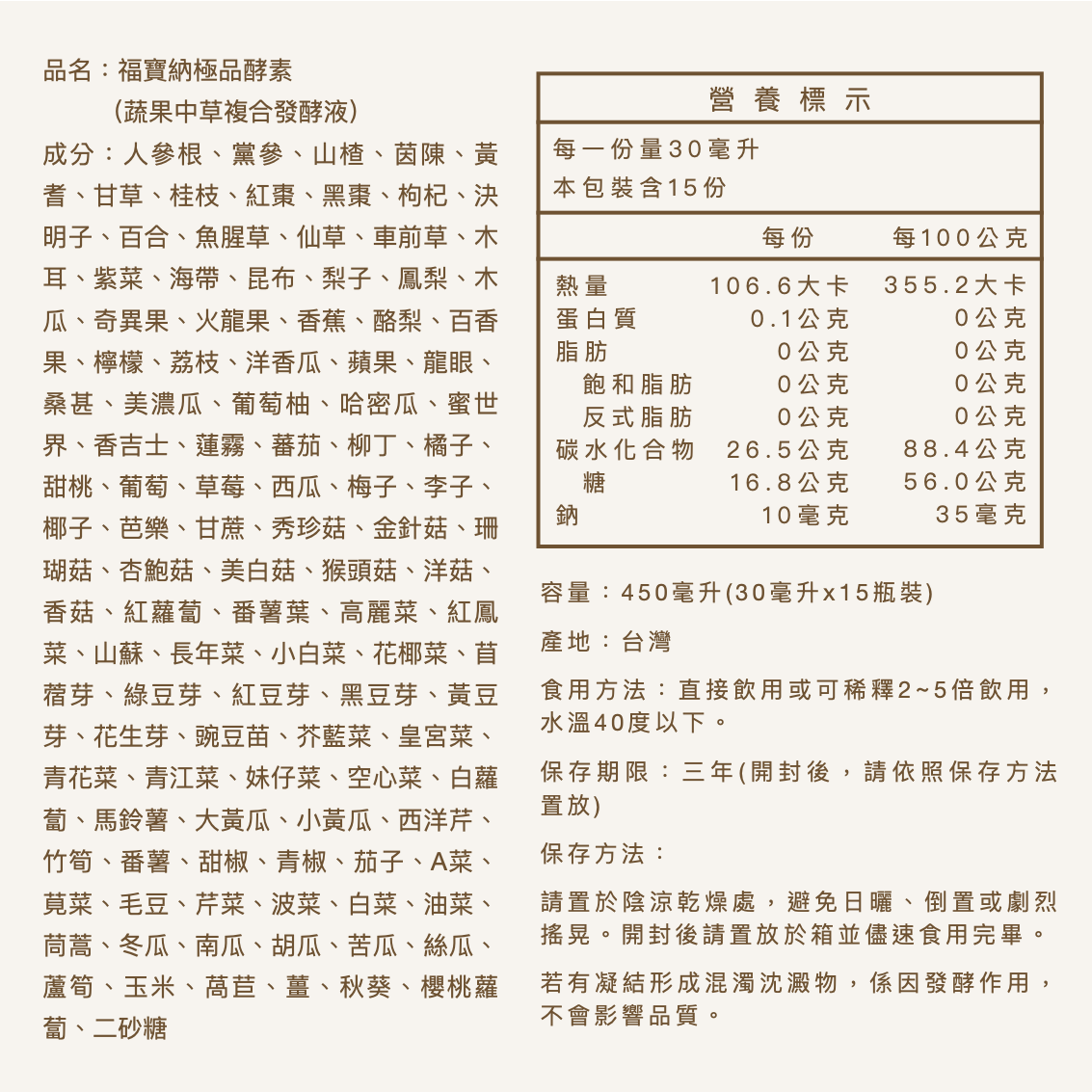 百種當季新鮮蔬果與珍貴中草複方,遵循傳統智慧結合現代生物科技,達到相輔相成的加強作用。中