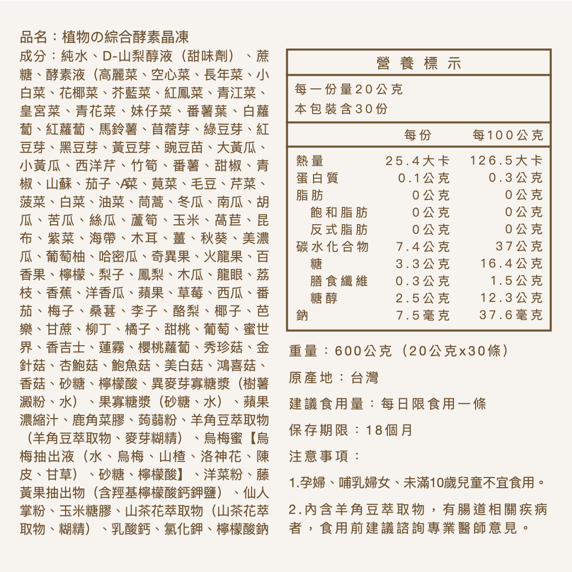 內含多種蔬果酵素,結合鳳梨酵素、木瓜酵素、益生菌與膳食纖維,幫助消化、促進代謝。清爽晶凍口